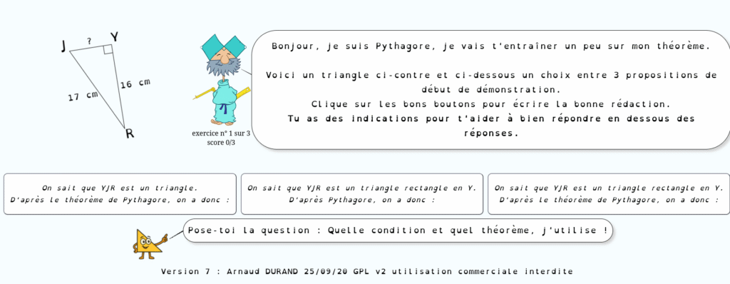 Voici l’exerciseur sur le théorème de Pythagore, voici quelques améliorations , images plus jolies, j’ai ajouté une option d’aide où un petit triangle donne une indication pour la réponse.