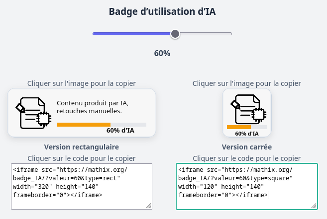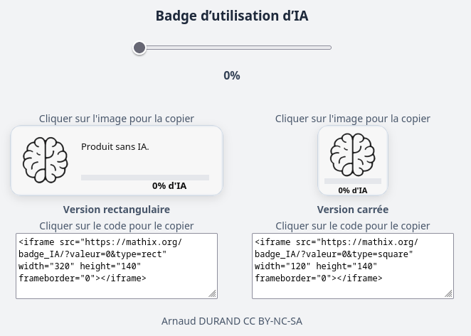J’ai donc potassé un projet de badge d’utilisation de l’IA. J’avais vu des badges 100% sans IA, mais je trouve cela trop catégorique et une personne ayant juste fait relire par une IA un contenu dirait que c’est 100% sans IA car elle a fait le gros du travail.