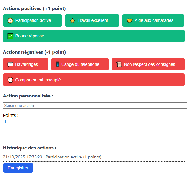 - Historique et total de points visibles sur chaque fiche élève.