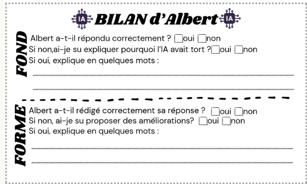 Pour rappel, Albert est un LLM (type ChatGPT) présenté comme un camarade de classe faillible. Il réalise les mêmes exercices que les élèves, et ses productions sont projetées au tableau pour être critiquées, comme un élève peut montrer son travail au tableau.